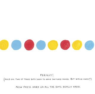 A yellow dot. An invitation to press on it. Then turn the page, see what happens: two yellow dots! Press again, ta-dah: three dots! What happens if you poke, blow on or even tip the book on its side?