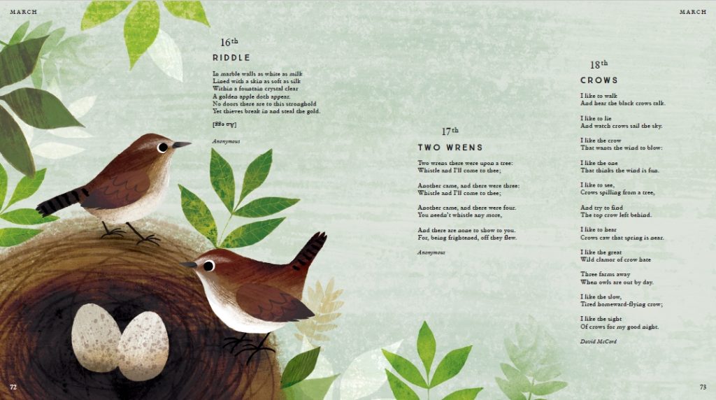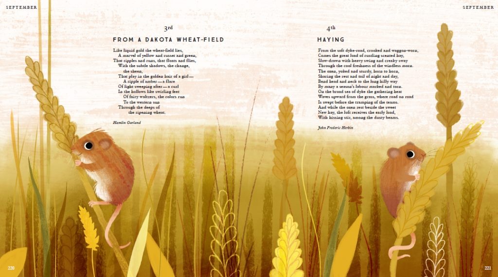 With the first hints of autumnal weather, a magical time comes upon us: it is the season of gift books and other beautiful editions (part of Jólabókaflóðið, as Icelanders would call it), ready for shoppers who seek Christmas gifts. You will be hard pushed this year to find a more beautiful specimen than I Am the Seed that Grew the Tree (Nosy Crow), an anthology of poems selected by Fiona Waters and illustrated by Frann Preston-Gannon, published in association with the National Trust. Comprising of just over 33o pages of poetry, this hefty hardback is clothbound, has a ribbon marker and is illustrated throughout with full-spread illustrations (a huge undertaking for a single illustrator) which together really do make it a rather sumptuous gift. The texts have been chosen to create a collection which is a timeless ode to nature, with an amazing selection of poets, classic and contemporary: Thomas Hardy, Ted Hughes, Carol Ann Duffy, E.E. Cummings, John Updike to name a few. The selection is varied, and there is something for every one. Flicking through the pages thanks to Frann Preston-Gannon’s organic palettes and gentle style, readers find themselves taking a stroll through the seasons, inhaling the smells of spring, feeling the breeze that gently sways the wheat, or feeling the chill of the early morning fog: