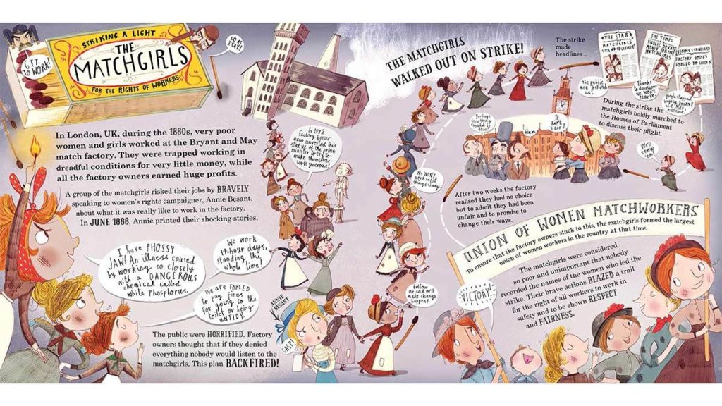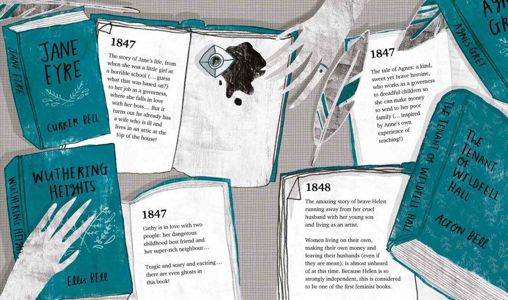 In Fantastically Great Women Who Worked Wonders (Bloomsbury Children’s Books), the third installment of her bestselling series, Kate Pankhurt focuses on women who were pioneers in their respective careers and therefore simultaneously challenging social barriers. The book introduces readers to inspirational women from an eclectic selection of industries, from creating animation to studying volcanoes. Even match box girls are included, and while their career might not be one to be envied, their inspiring work on workers’ rights is brilliantly documented. Bursting with energy and colour, with a really dynamic format, this is a brilliantly engaging read for younger readers. Another book that focus on an unusual choice of career for a woman, at least in her own time, is the striking The Bluest of Blues by Fiona Robinson (Abrams), which is a picture book biography of Anna Atkins, a British botanist and photographer, who published the first ever book of photography, in 1843. Illustrated mainly in hues of blue, this is an absolutely stunning book; Atkins’ subject of study allows Robinson to create intricate illustrations, showcasing her talent. There is an fascinating note on Robinson’s artistic process at the end of the book. Don’t miss out the exquisite endpapers! Like The Bluest of Blues, The Brontës by Anna Doherty (Wren & Rook) is written in the present tense, making this introduction to the sisters and their lives and work really accessible to young readers. Despite the nineteenth century premise, the artwork, created using a mixture of hand drawing, digital work and with an innovative use of texture, gives a contemporary feel to the story which again helps make the book more accessible. The background information provided it at the end as to why the Brontës were in many ways ahead of their time also gives great context. Another literary pioneer is the subject of a book from a new series from Quarto, who have led the way for much of the Inspiring Women published with their ground-breaking “Little People, Big Dream” series. This new series for older readers is called”Work it, Girl”, and its first title is Boss the Bestseller List like J.K. Rowling, written by Caroline Moss and illustrated by Sinem Erkas. With lots of information, quotes, and 10 key lessons to learn from her life and work, this is an engaging read which is accompanied by unusual paper collage artwork.